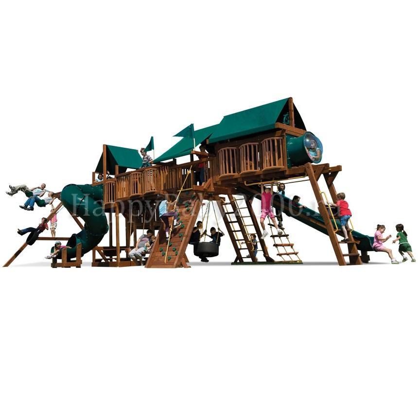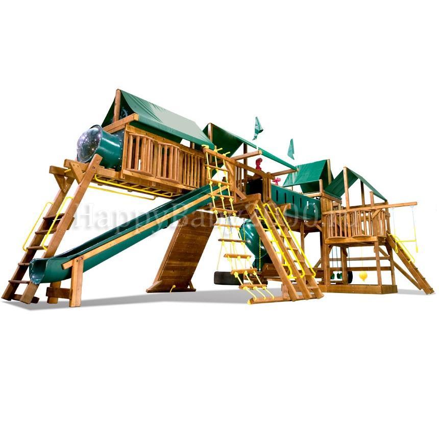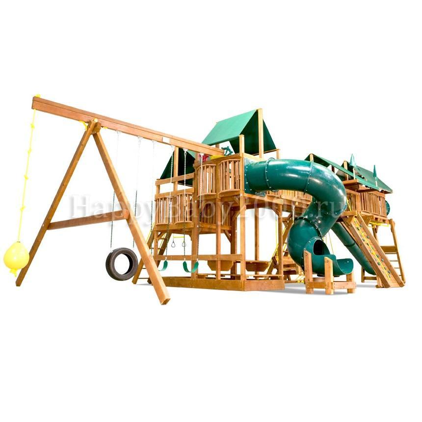 Переход деревянный и пластиковый между башнями, большие деревянные качели со спинкой.