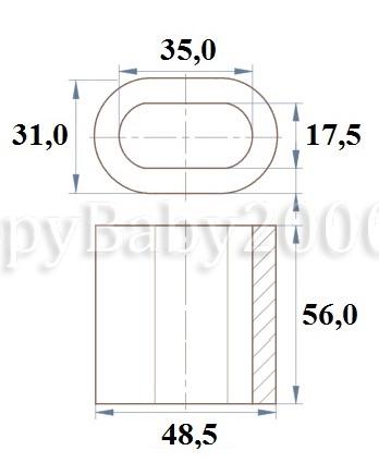 Обжимная гильза овального сечения для каната диаметром 16 мм. Тип гильзы «Е». Изготовлена из алюминиевого сплава. Применяется для обжатия каната, пропущенного через коуш. Гильза фиксирует соединяемые части каната и обжимается 550-тонным прессом. После обработки прессом гильза имеет круглое поперечное сечение. Выдерживает нагрузку на соединение до 20 kN.