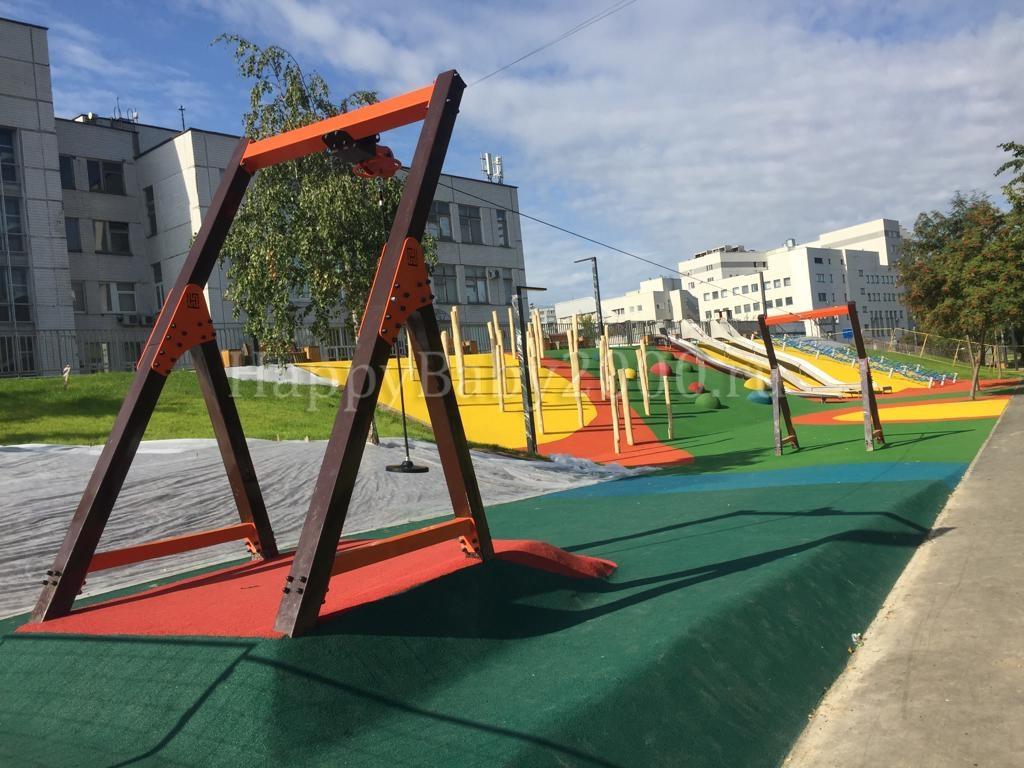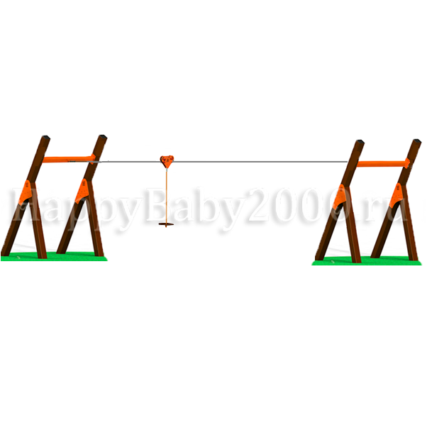Комплектация: стартовая и финишная опоры, устройство для натяжения троса, трос с крепежом и комплектующими, подвижная каретка из конструкционной стали с металлическими роликами на подшипниках, сиденье с подвесом, тормозная пружина с резиновым буфером, резиновый буфер стартовой точки крепления троса.