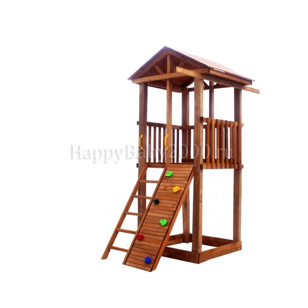Детский игровой комплекс М2-0 с узким скалодромом и деревянной крышей предназначен для дач, коттеджей.