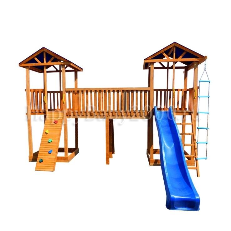 Детский игровой комплекс М22-1 с узким скалодромом и тентовыми крышами предназначен для дач, коттеджей.