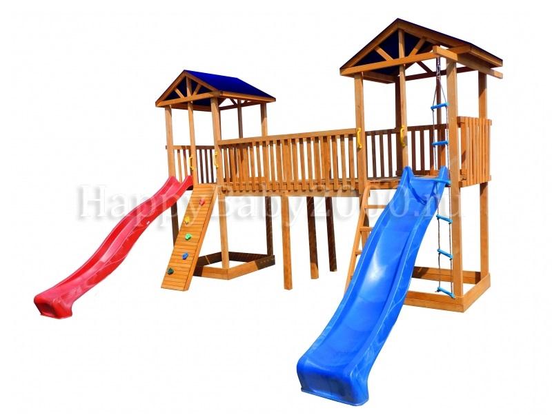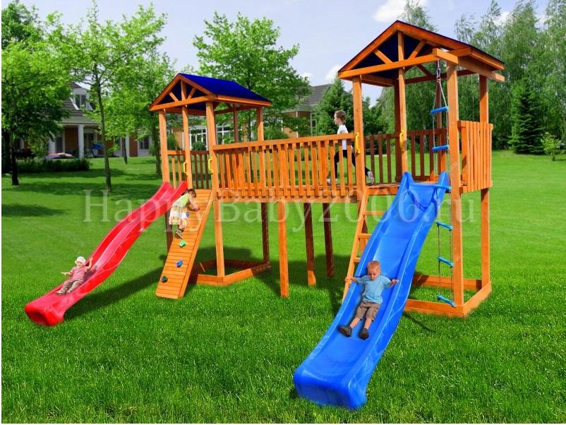 Детский игровой комплекс М22 с узким скалодромом и тентовыми крышами предназначен для дач, коттеджей.