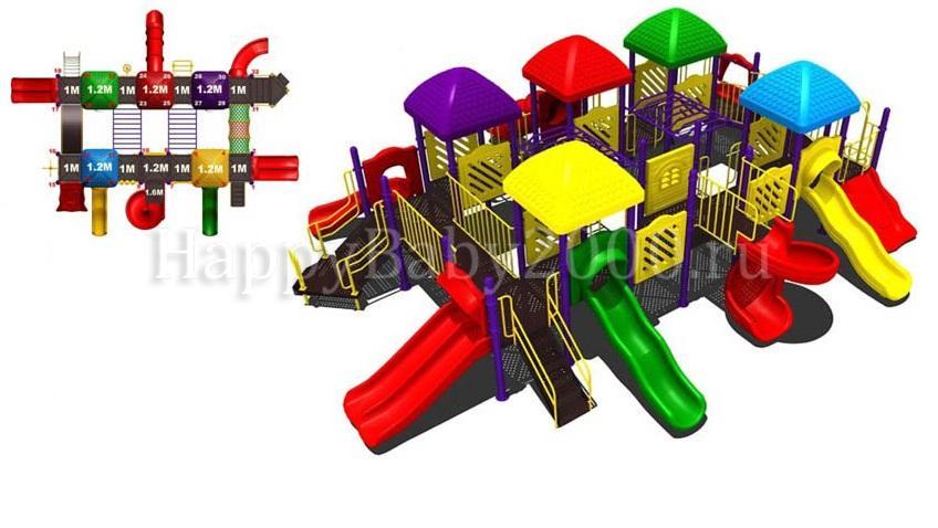 - Пластиковые детали (горки, крыши, стенки и т.д.) изготовлены из качественного импортного пластика (ПНД - пищевой полиэтилен низкого давления антивандальный, атмосферостойкий) с применением УФ-фильтров и современных красителей (срок эксплуатации - 20 лет).