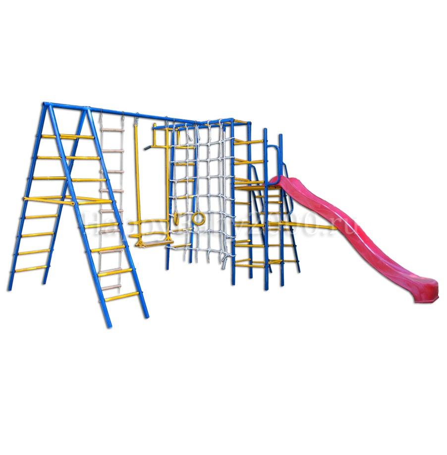 Размер: 310 х 350 х 220 см. Нагрузка (общая): 100 кг. Комплектация: сетка, качели, веревочная лестница, кольца, канат, горка: 2.5 или 3.0м. Масса: 133,0 кг.