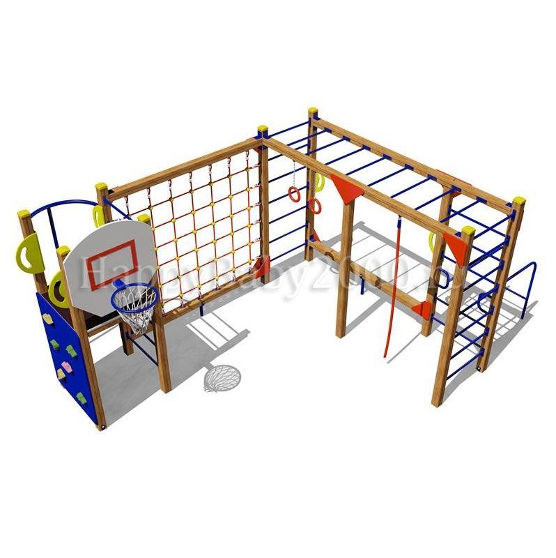 Комплектация: параллельные брусья, четыре шведские стенки, рукоход, сетка из каната, гимнастические кольца пластиковые, скалодром, баскетбольное кольцо, канат для лазания, стойки и перекладины. Доп. комплектация: шест для лазания - 19т.р.