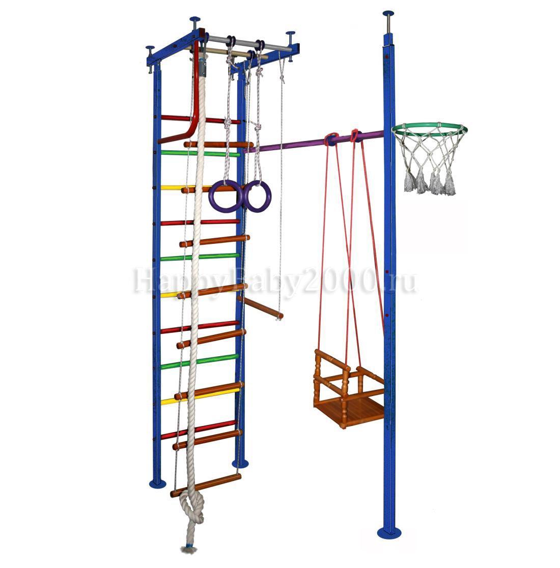 Комплектация: шведская стенка, турник, баскетбольное кольцо, деревянные качели, трапеция, веревочная лестница, гимнастические кольца, канат.