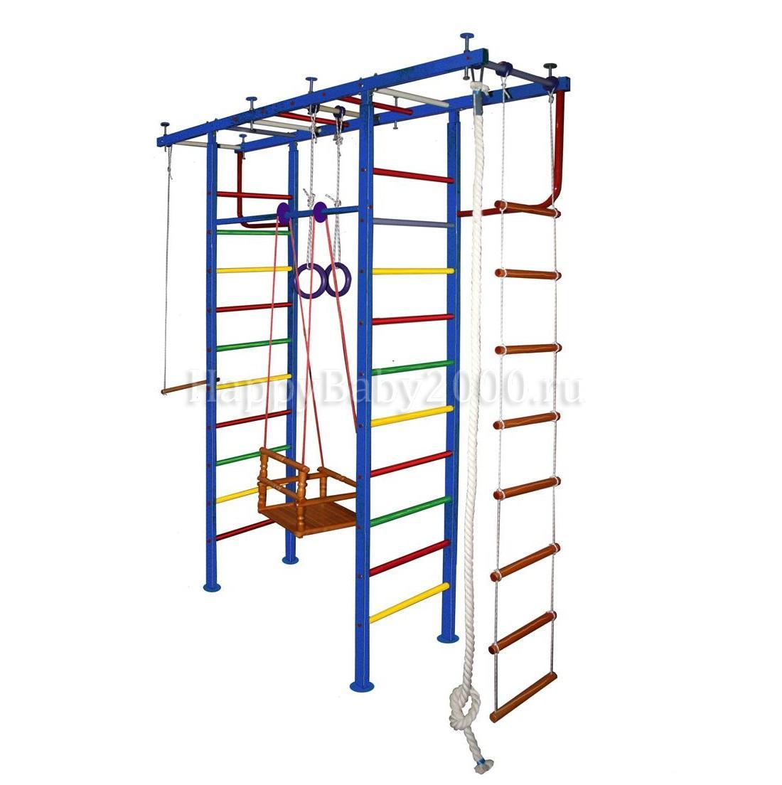Комплектация: рукоход на двух шведских стенках 45см., турник - 2шт., деревянные качели, трапеция, веревочная лестница, гимнастические кольца, канат.