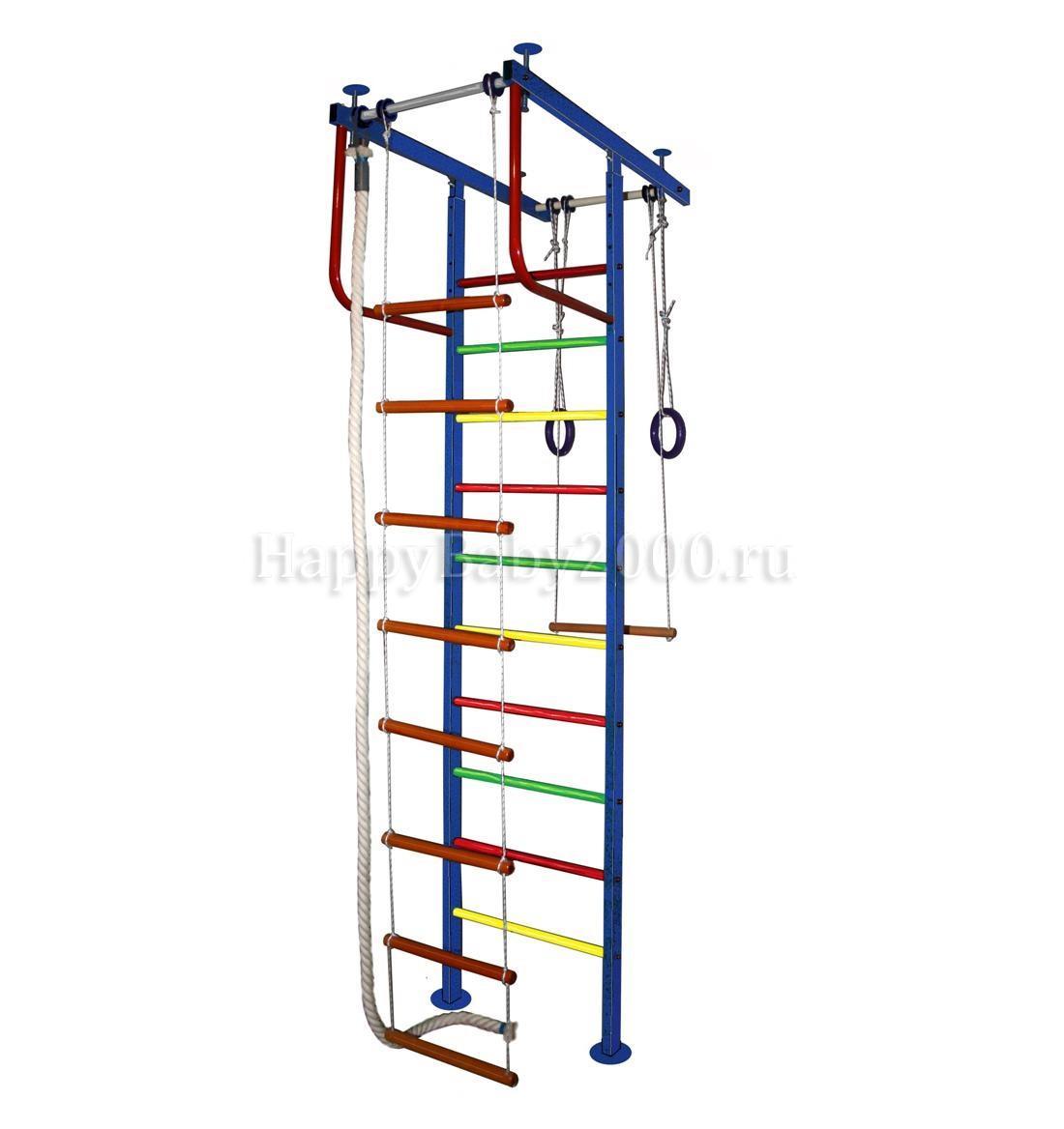 Комплектация: шведская стенка, турник - 2шт., трапеция, веревочная лестница, гимнастические кольца ,канат.
